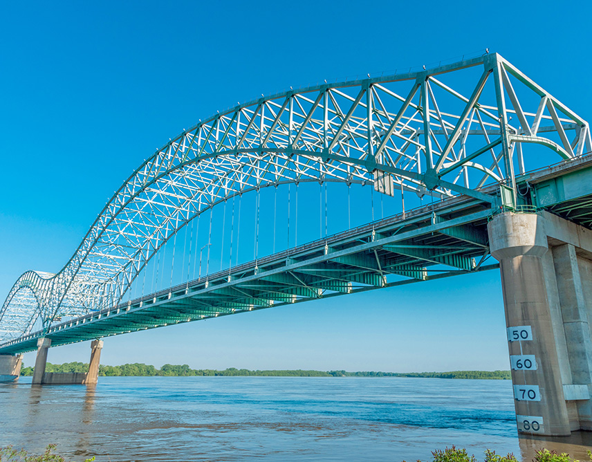 The Hernando de Soto Bridge is a steel-tied arch structure that carries Interstate 40 (I-40) across the Mississippi River between Arkansas and Tennessee. As one of only two crossings of the Mississippi River in the Memphis area, the bridge is a vital transportation, commerce, and defense link, carrying approximately 60,000 vehicles daily.
