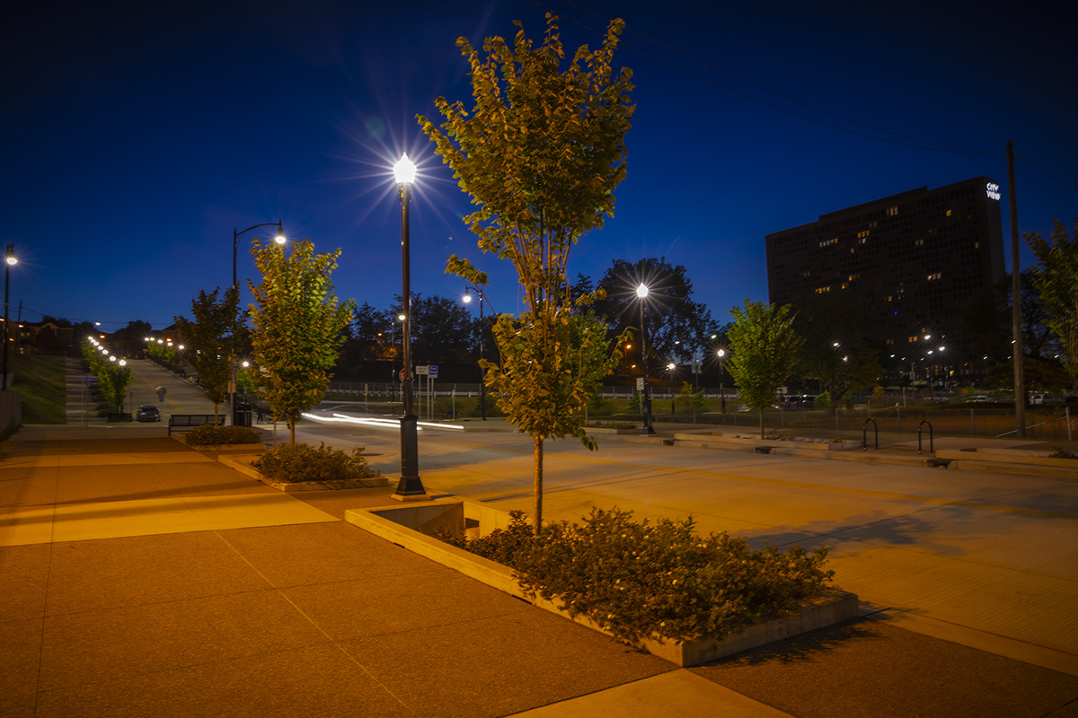 Of special significance are the 134 Michael Baker-designed bioretention tree wells that are incorporated along the sidewalks to capture, control and treat the “first flush” of rainfall. Each well measures six feet wide by 20 feet long and are spaced 10 feet apart. The tree wells act as stormwater retention basins, providing access to water that can be used by the plant or evaporated. Each tree well is designed to hold a minimum of 1,500 gallons of water.
