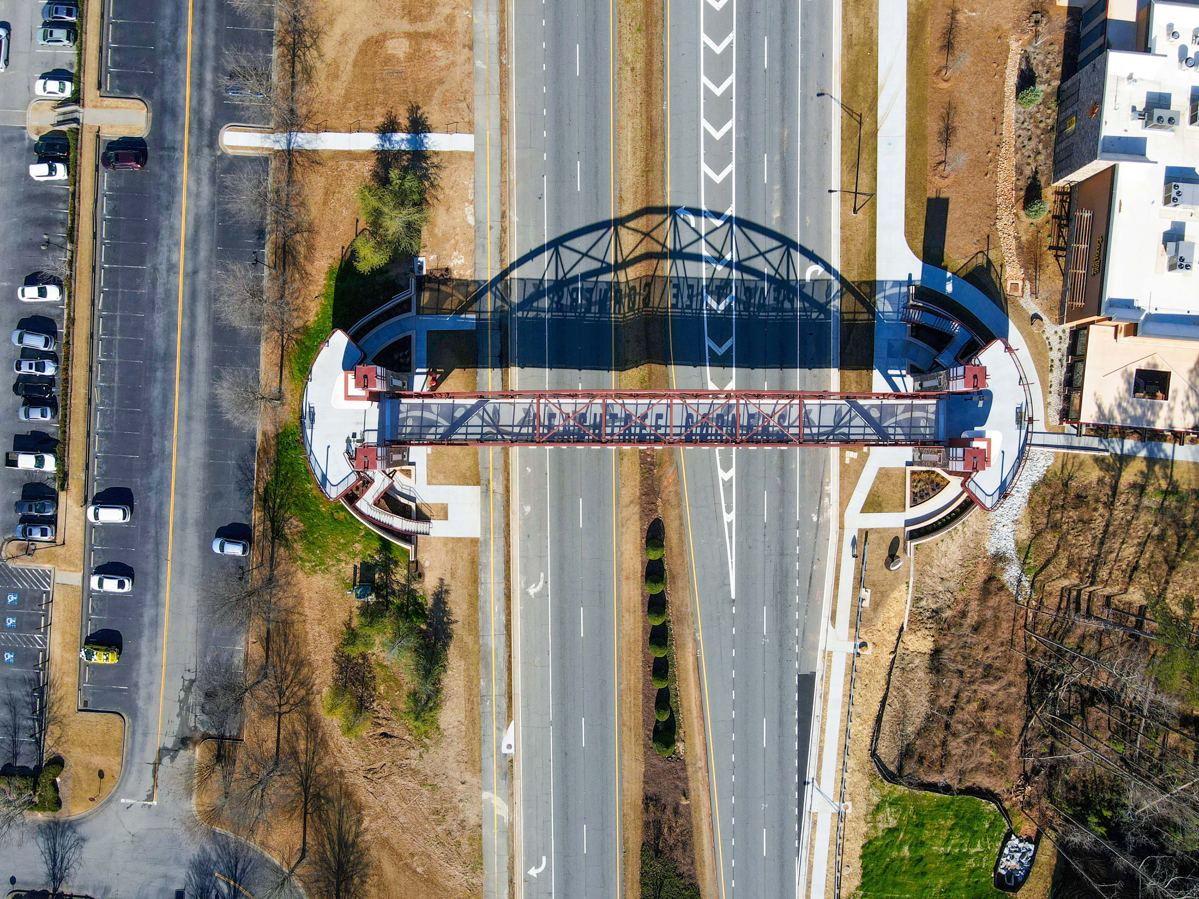 The Peachtree Parkway Pedestrian Bridge is a 190-foot-long truss arch that crosses over S.R. 141 (Peachtree Parkway), a four-lane highway with an average daily traffic of nearly 40,000 vehicles. The roadway links the suburbs with downtown Atlanta and connects the Forum, an existing shopping mall, with the Town Center, a new site that includes shopping, recreation, dining and residential space. Additionally, the location houses an amphitheater and green space. This pedestrian bridge serves not only as a connectivity point between the two developments but as a landmark and gateway to Peachtree Corners.