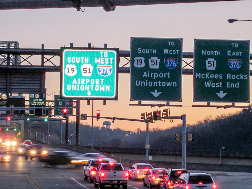 The system incorporated full-color LED DMS guide signs adjacent to static guide signs and LED Lane Use Traffic Control Signals – a first-of-its-kind installation of a coordinated/integrated system in western Pennsylvania. A new fiber optic backbone provided communication from the field master controller to local traffic signal controllers, as well as DMS sign controllers simultaneously, allowing for the City of Pittsburgh police department to implement multiple reversible lane scenarios at the flip of a switch. The project involved extensive coordination with various stakeholders, PennDOT and the City of Pittsburgh.